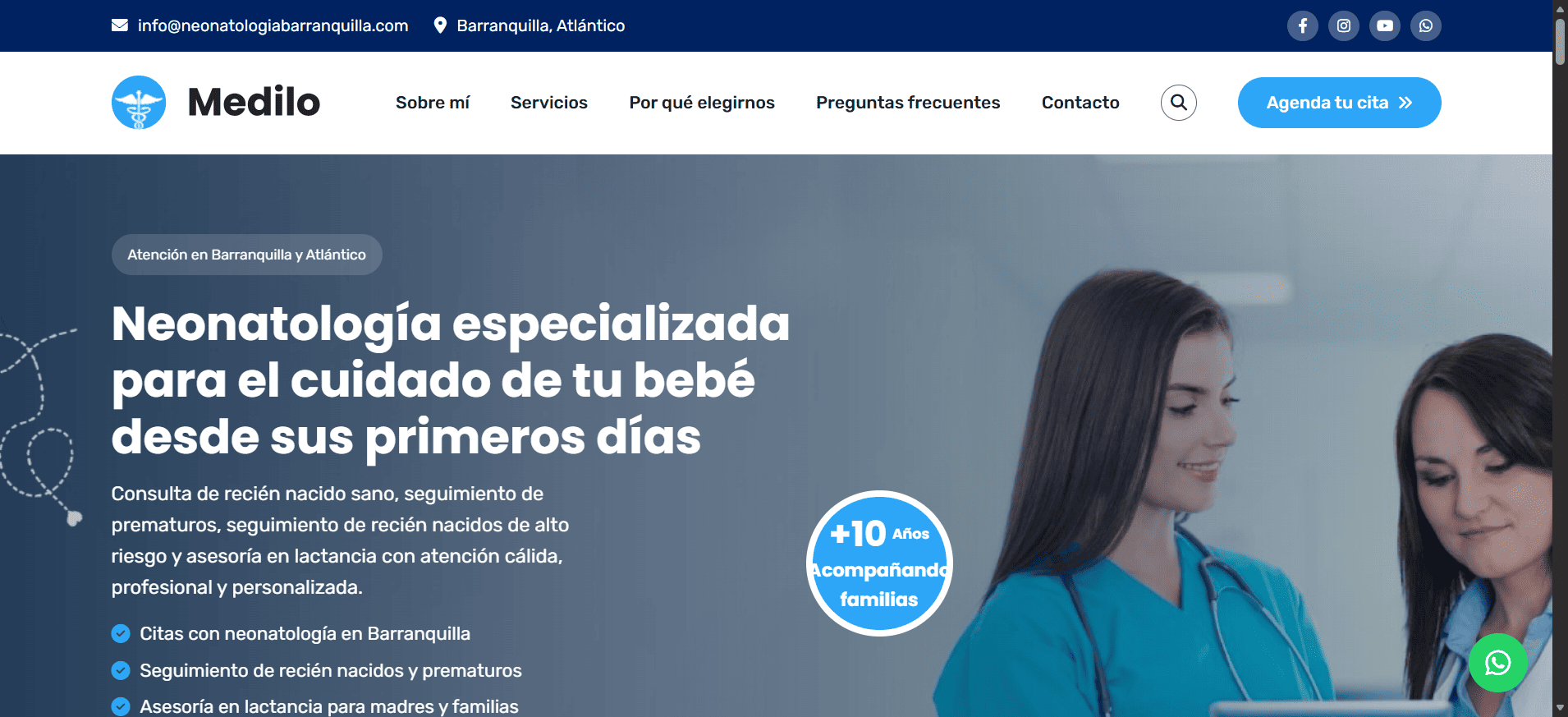Sitio web desarrollado para una profesional de la salud con foco en neonatología y pediatría, pensado para transmitir confianza, autoridad y cercanía. La estructura combina presentación profesional, servicios, zonas de atención y canales de contacto orientados a facilitar la captación de pacientes.