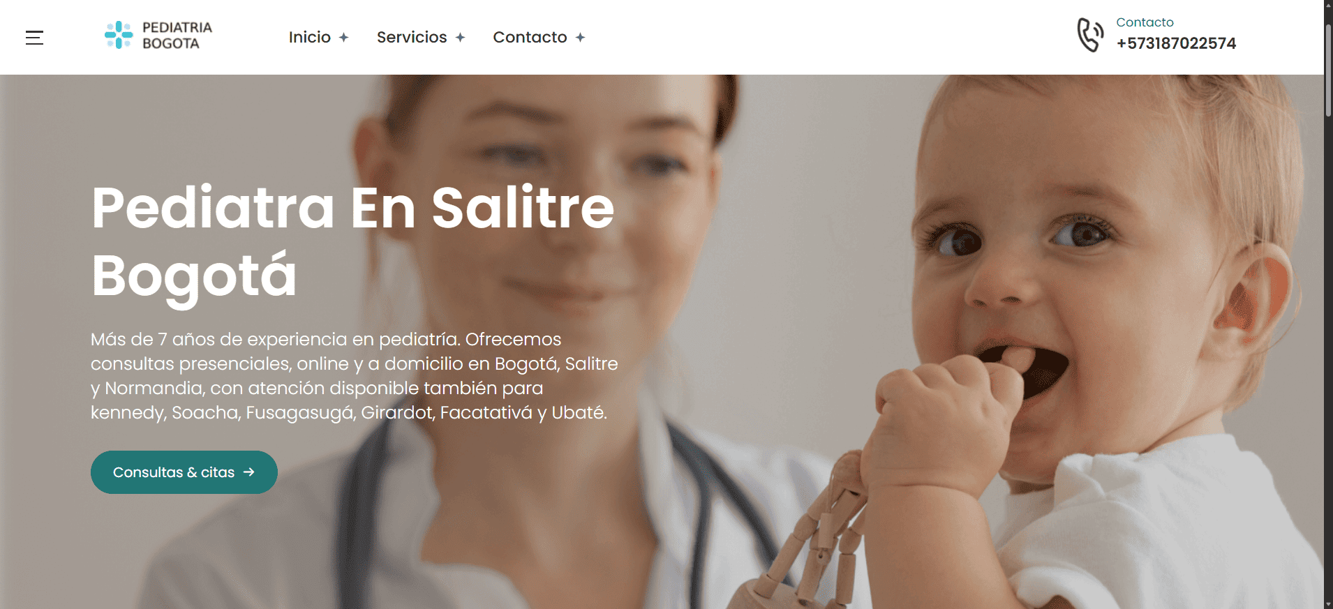 Sitio web desarrollado para una pediatra en Bogotá, con foco en transmitir confianza, explicar servicios y facilitar el contacto con familias que buscan atención profesional. La estructura combina presentación médica, servicios, consultas presenciales y virtuales, contenidos informativos y canales de contacto orientados a conversión.